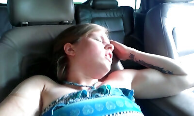 Pallid huge breasted brunette masturbates her twat on back seat in the truck