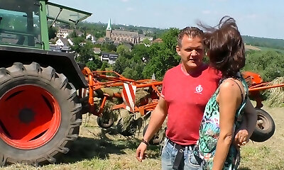 Leaned over the tractor mature village tart gets nailed from behind