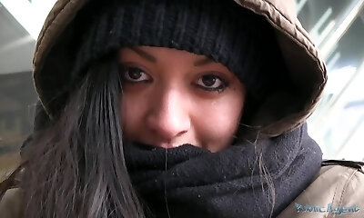 Appetizing babe shows her yummy caboose in public and rides Nick Moreno's fuck-stick indoor
